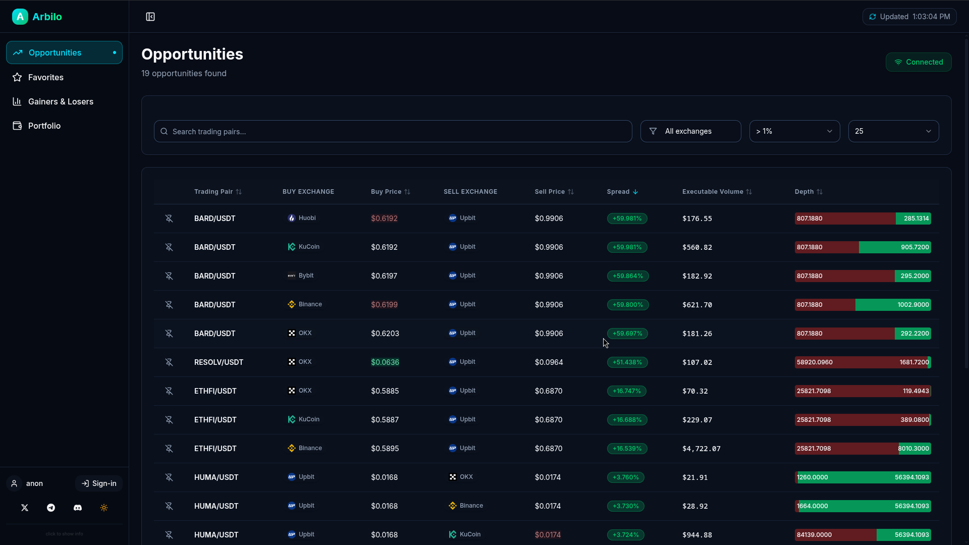 A Realtime arbitrage screener for crypto
